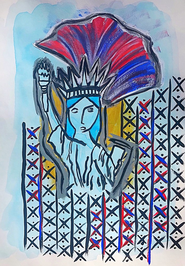 Art Statement: Liberty may be described as an essential human right. This rendering of Lady Liberty demonstrates the familiar details of her imagery, but also includes the recognizable plumed helmet of Greek goddess Pallas Athena. Said goddess served as a personification of wisdom—and in light of the January 6th Insurrection—her essence imperative alongside liberty so pursuits of freedom may be constructive rather than destructive.